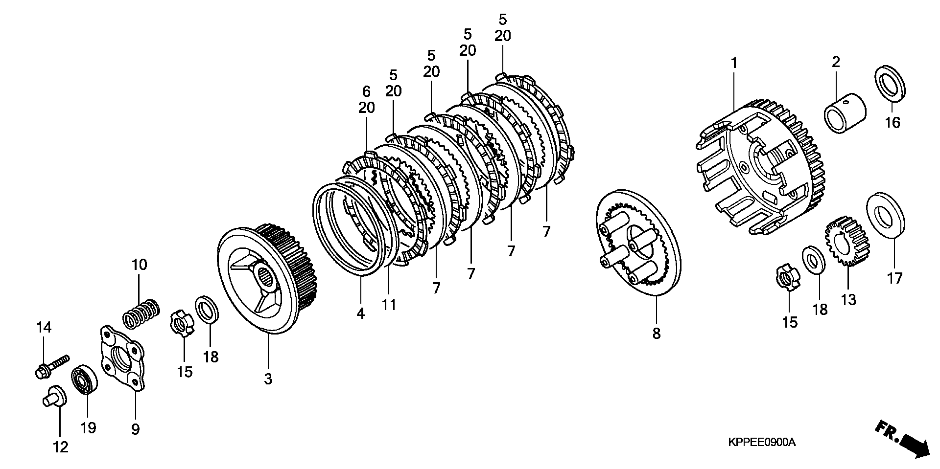 Kytkinlevy Honda CBR 125 R 2004-2011 - OEM Alkuperäinen Honda varaosa. Kuvassa nro 20.